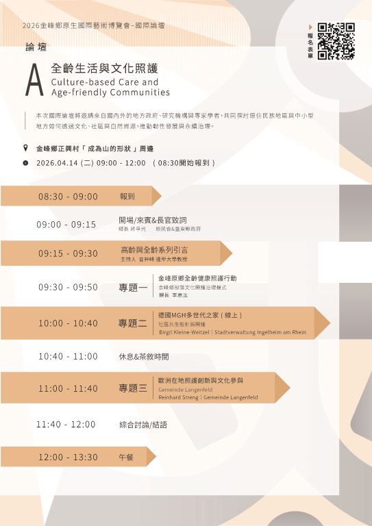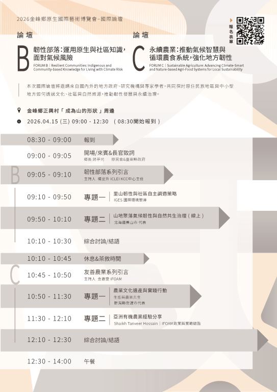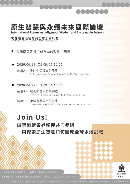 | 主旨: | 檢送臺東縣金峰鄉所辦理「2026金峰鄉原生藝術國際博覽會原生智慧與永續未來國際論壇」,歡迎各單位踴躍參加,請查照。 |
