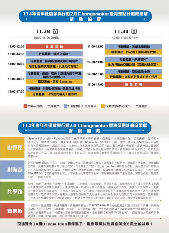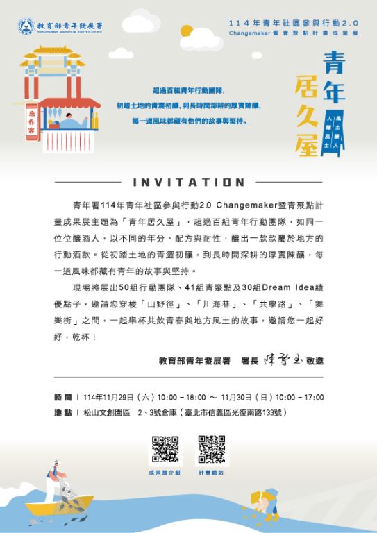【轉知】教育部青年發展署辦理114年青年社區參與行動2.0 Changemaker暨青聚 點計畫成果展「青年居久屋」,敬邀蒞臨
