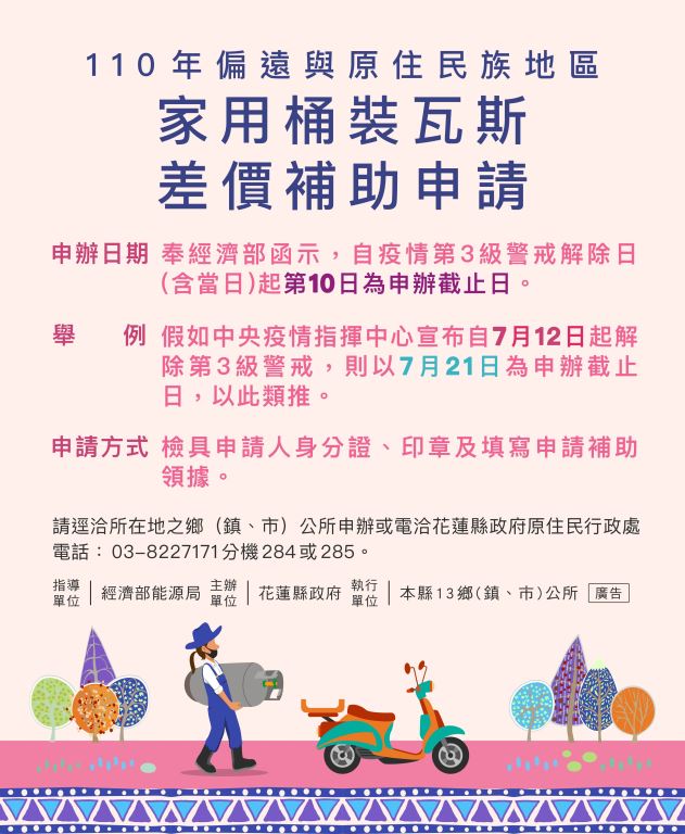 家用桶裝瓦斯差價補助,係以戶籍地之村(里)認定補助與否及補助金額,與族群身分無關,鼓勵符合申請資格的所有鄉親踴躍申請。相關申請規定,請於受理申請期限內逕洽戶籍所在地之鄉(鎮、市)公所申辦,或電洽花蓮縣政府原住民行政處詢問(電話:03-8227171分機284或285,承辦人曾先生)。