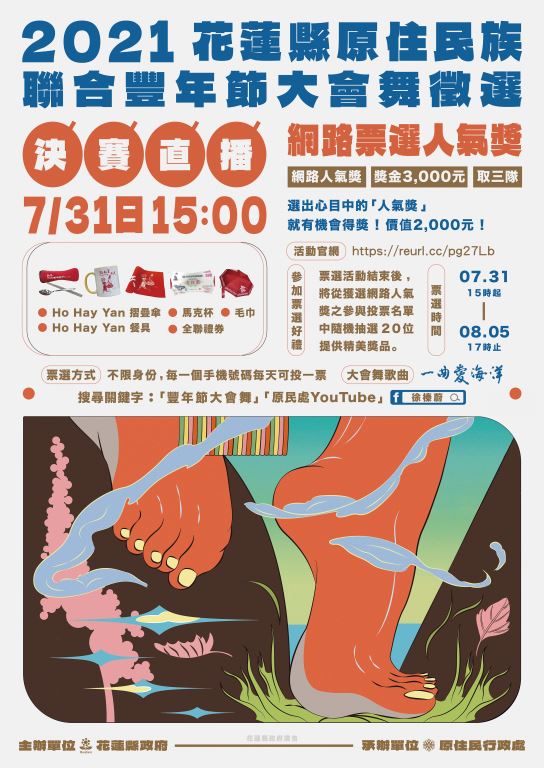 2021花蓮縣原住民族聯合豐年節大會舞競賽,將於7月31日(六)下午3時於臺灣原住民族文化館進行第二階段決賽,全程以線上直播並首創網路票選人氣獎方式,邀請喜愛大會舞的民眾共同參加,也讓更多人欣賞到年度大會舞優美舞姿。