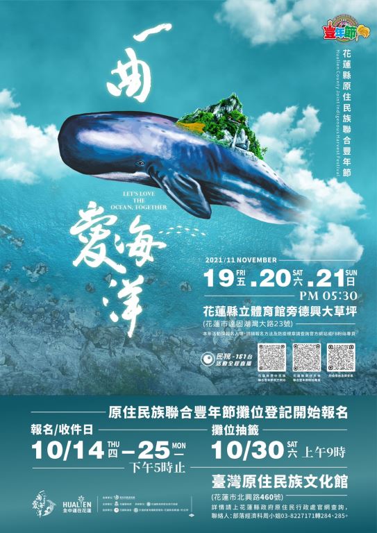 今年花蓮縣原住民族聯合豐年節將於11月19日至21日連續三天在花蓮縣立體育場旁大草坪舉行,今年主題是「一曲愛海洋」,將邀約設籍花蓮縣,年滿二十歲以上具原住民身分之手工藝、美食、農特產及伴手禮品業者共同前來參與設攤,藉以展現東部海洋在地部落產業多元特色,活絡原鄉經濟,呼喚更多民眾親身造訪體驗一曲愛海洋的熱鬧氛圍。