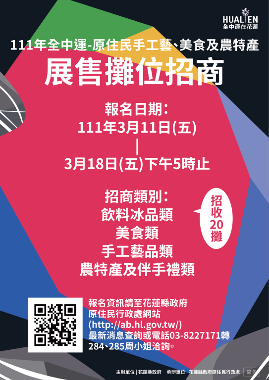原民處陳建村處長表示,111年全中運展售攤位分配,依中央流行疫情指揮中心規定辦理,並視疫情狀況調整規模及攤位數量,另抽取備取攤商,凡符合招商對象者,可至花蓮縣政府(原住民行政處)網站【http://ab.hl.gov.tw/】最新消息下載相關報名簡章,或親洽縣府原民處部落經濟科索取。
