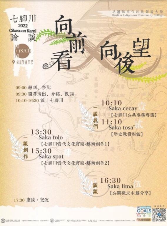 為延續文化傳承與未來展望,花蓮縣政府原住民族部落大學、國立臺灣史前文化博物館及在地組織花蓮縣壽豐鄉壽農社區發展協會,今(15)日共同辦理「2022 Cikasoan Kami七腳川論談:向前看X向後望」,縣長徐榛蔚到場鼓勵不同族群間的青年來共同延續歷史的軌跡,期望在論談後對於文化保存有更多的啟發。