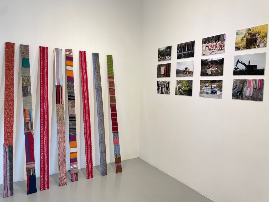 一層又一層巨大的岩石切面讓礦區呈現一種人為後的自然景觀,階梯式的壁面不斷往下,與山原本高聳的姿態呈現極度的對比;此處的蛇紋石礦脈因為含有氧化鐵的成份,切割開後的石面與空氣長期接觸,滲出紅色斑駁的痕跡。面對這浩瀚景象,自然卻又不自然的場域,林介文在編織與礦石開採的議題間產生對話,帶領不同族群的織者走入山中,以柔軟的Qabang(被毯)包裹山林,在山裡寫下當代女性織者回應時代的思維。