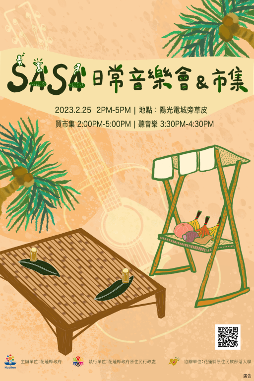 為提供喜愛歌唱及音樂創作者展現自我的演唱平台,花蓮縣政府原住民行政處每個月將定期在陽光電城原住民文創館周邊草地辦理音樂會,歡迎機關團體、學校社團、原民朋友們踴躍向原民處提出演出申請。本週六(2/25)將舉辦SA'SA'日常音樂會和市集,現場不僅有工藝、農特產、咖啡、輕食,還邀請台灣原住民知名樂團檳榔兄弟,以及榮獲金曲獎最佳原住民歌手獎的阿努,在悠閒的午後,用優美歌聲為大家帶來一場奇妙的音樂饗宴。