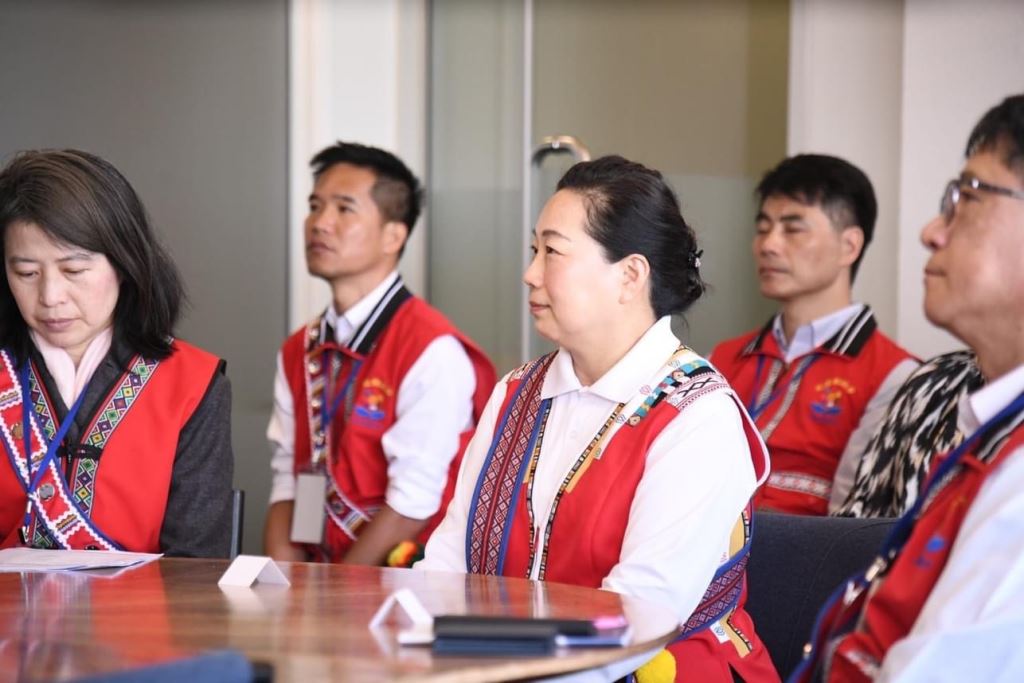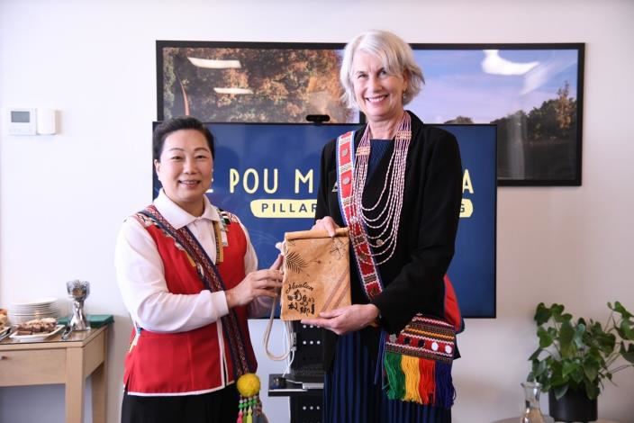 最後徐縣長致贈Paula Southgate市長織有太魯閣族祖靈之眼圖騰的傳統織布、情人袋與陶土項鍊,並盛情邀請市長及其團隊未來務必前往花蓮,讓南島語系的家人能有更深度的了解與交流。