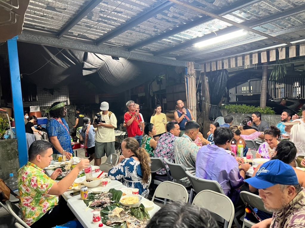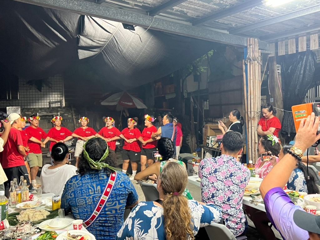 大溪地眾人在Palimaay家族熱情獻唱歡迎歌的愉快氛圍下走進部落,接著,吉寶竿部落陳誠勇頭目進行祈福儀式。部落以新鮮、自然食材所精心準備的山珍海味更是讓大家垂涎欲滴、大飽口福。在品嚐過後,每位大溪地代表團成員都給予一致的好評,大讚部落美食佳餚!在享用的同時,財團法人原舞者文化藝術基金會代表也出席了此宴會展演精彩曲目,並與大溪地交流樂舞,大家在夜色朦朧的夜晚進行樂舞交流,將氣氛炒到最高點!
