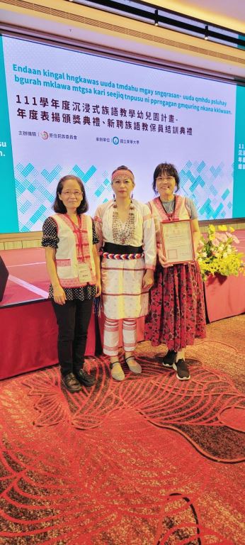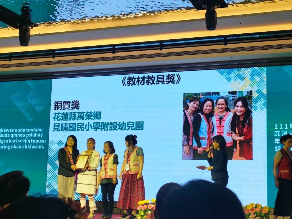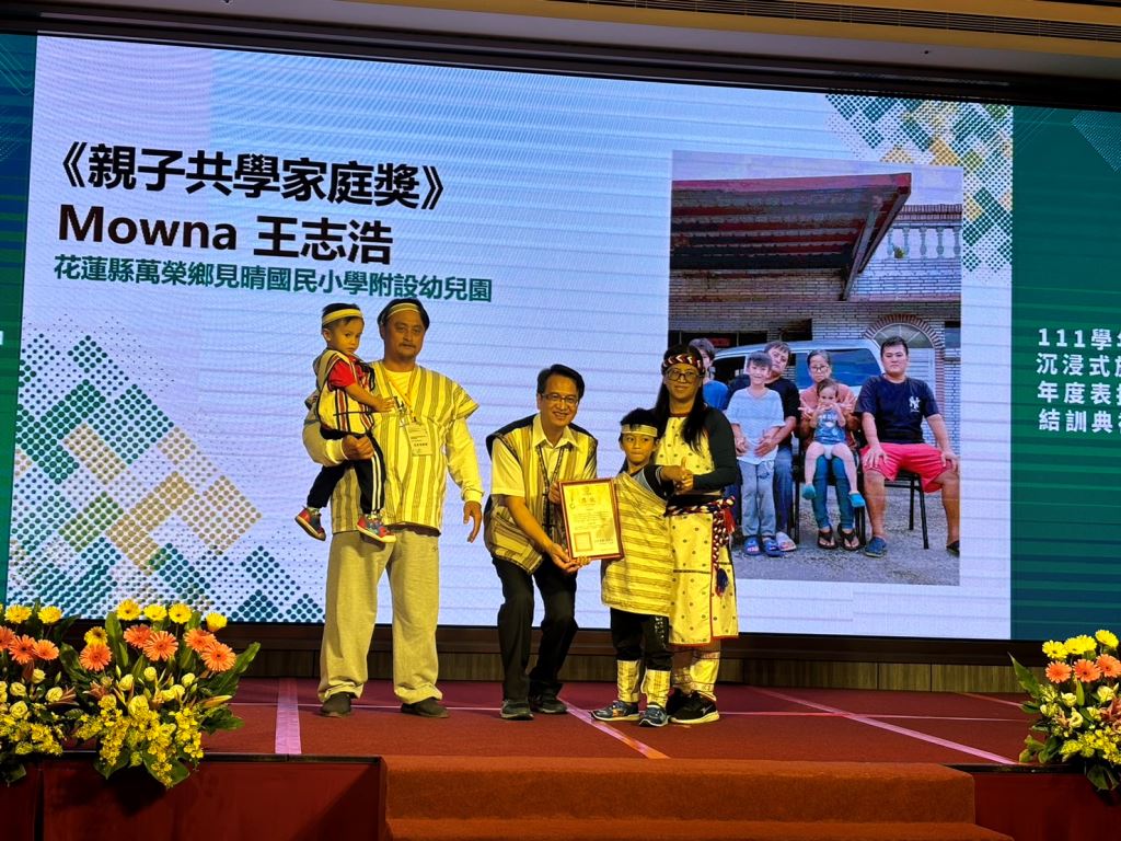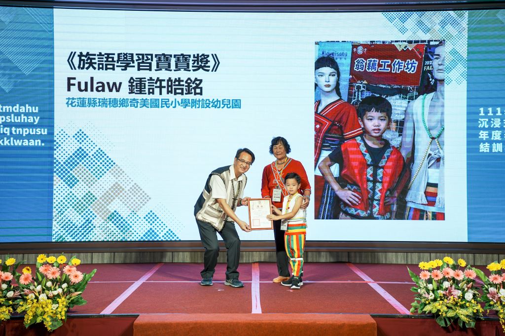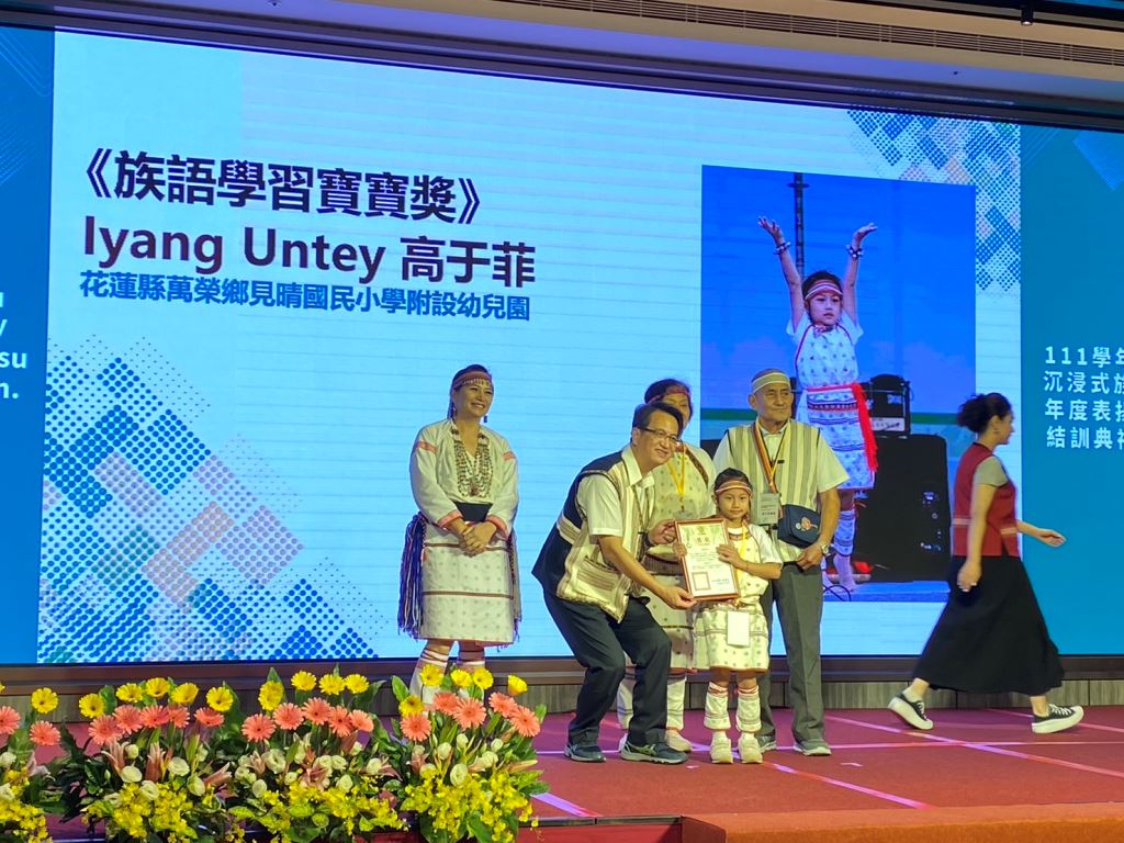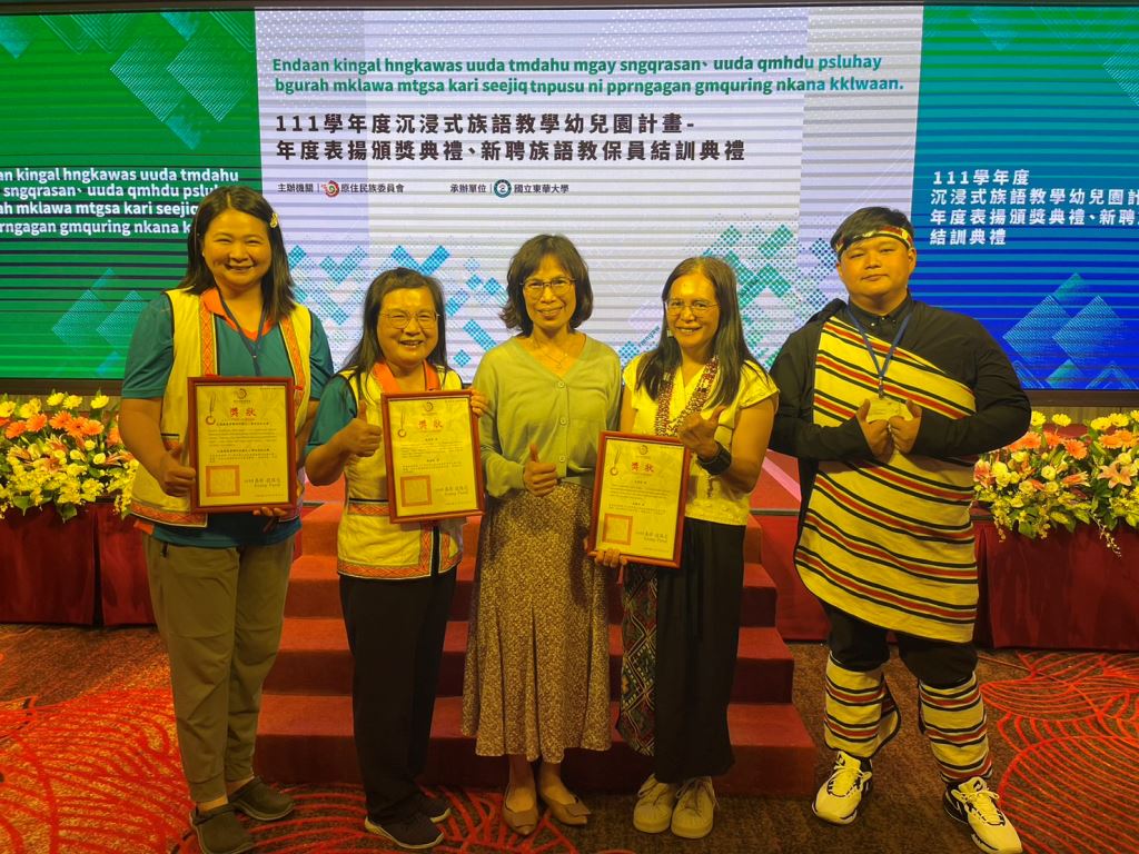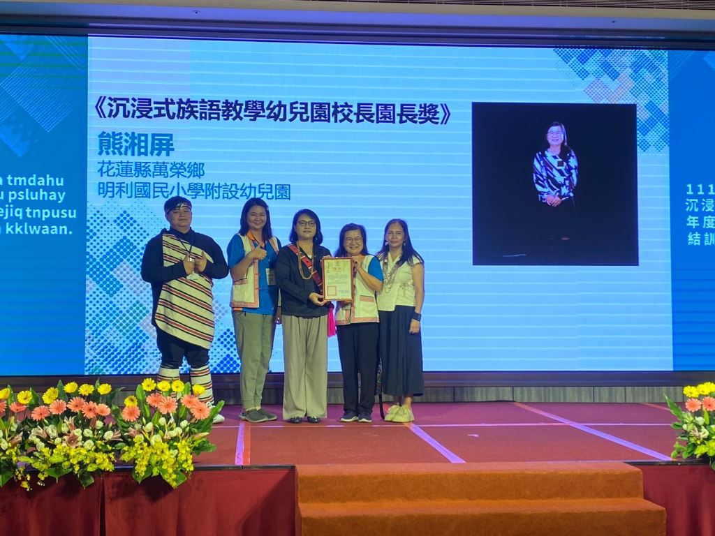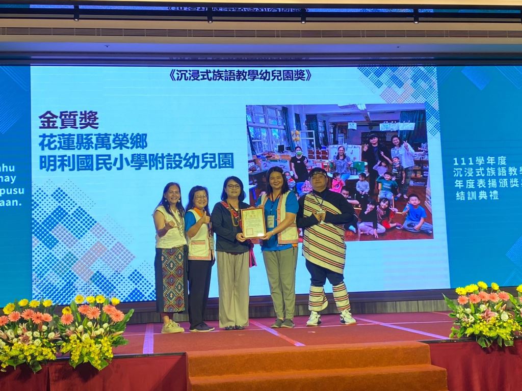 原住民族委員會21日在花蓮美侖大飯店舉行「111學年度沉浸式族語教學幼兒園計畫表揚頒獎典禮」,由原民會主任秘書王美蘋Akiku·Haisum親自頒發獎項,包括《最佳進步獎》、《績優族語學習寶寶獎》、《績優親子共學家庭獎》、《績優教材教具獎》、《績優協同教學人員獎》、《績優族語教保員獎》、《績優沉浸式族語教學幼兒園校/園長獎》以及《績優沉浸式族語教學幼兒園獎》等獎項,共表揚50組團隊和個人,其中花蓮縣表現績優6人及3校,共獲頒7獎項,成績亮眼。