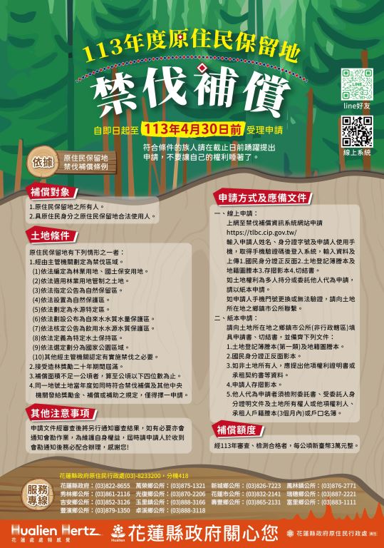 113年度原住民保留地禁伐補償即日起開始受理族人申請,縣長徐榛蔚呼籲符合申請資格的族人即日起至今(113)年4月30日止備齊相關證明文件,向土地所在鄉(鎮、市)公所提出申請。另外,為響應人民應用電子化申請及推動無紙化生活環境,自本(113)年度起提供網路線上申辦服務,以提供更便捷多元的申請管道,族人可以透過手機上網並拍照上傳相關文件在家申請,請族人多多利用!(連結. https://tlbc.cip.gov.tw/ )線上申請僅供土地所有權個人持有1/1(全部)可以申請,持分土地仍須至各土地所在公所申辦。