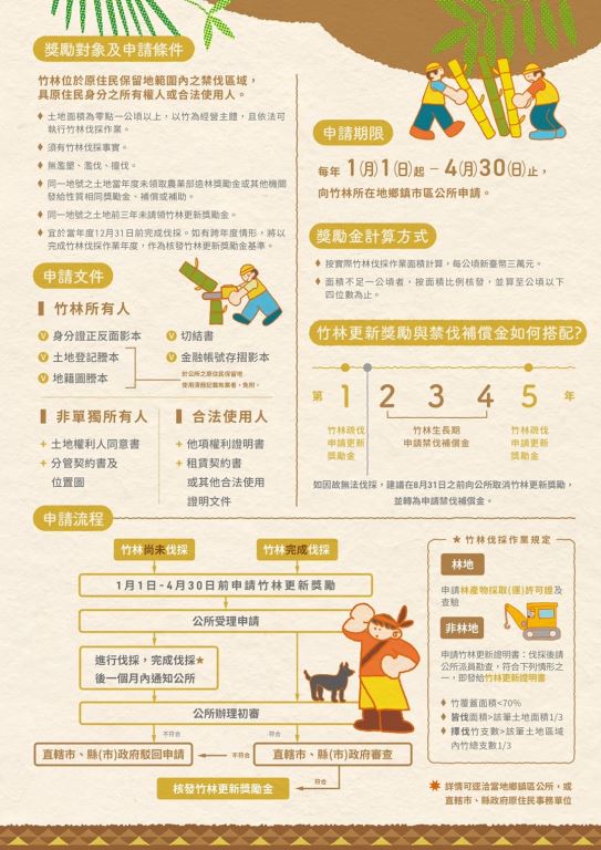 花蓮縣政府原住民行政處保留地管理科蔡樹芬科長說明,同一地號之原住民保留地「禁伐補償」與「竹林更新獎勵」僅能擇一申請。「作業規範」所定申請方式、申請期間、申領人及應備文件等,大部分與原住民保留地禁伐補償條例規定一致,以竹林所在地鄉(鎮)公所為受理窗口、每年辦理。竹林所有人或合法使用人在伐採時,由公所派員勘查後,認定竹林有施行伐採作業及符合者,發給原住民保留地竹林更新證明書,作為請領依據。惟竹林請領後須間隔3年以上始能再次請領。