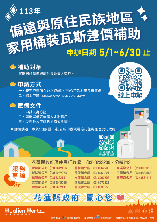 花蓮縣政府113年持續辦理「偏遠與原住民族地區家用桶裝瓦斯差價補助計畫」,受理申請自5月1日至6月30日止,請符合資格的親鄉把握時間至各鄉(鎮、市)公所辦理,且為提升申請的便利性,也可至經濟部能源局網站線上申請。