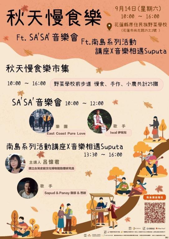 花蓮縣政府將於9月14日在原住民族野菜學校熱鬧舉辦秋天慢食樂活動,首次結合SA’SA’日常音樂會和南島系列講座,為廣大好朋友們獻上以慢食、音樂與南島文化,呈現出在地花蓮最美好的文化盛宴。