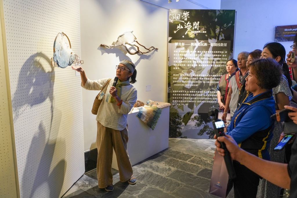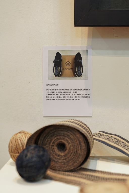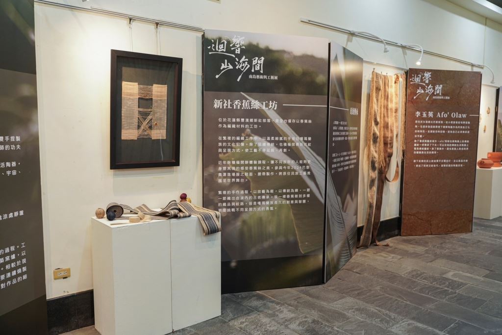 「迴響山海間 南島藝術與工藝展」,展示來自花蓮豐濱鄉的Lala Ban噶瑪蘭族新社香蕉絲工坊提供了18件作品,其中包括由工藝師嚴玉英為2024年巴黎奧運開幕式打造的運動員配件-腰帶和鞋面,這不僅是對中華健兒的祝福與平安,也向國際展示了香蕉絲編織的精湛技藝。