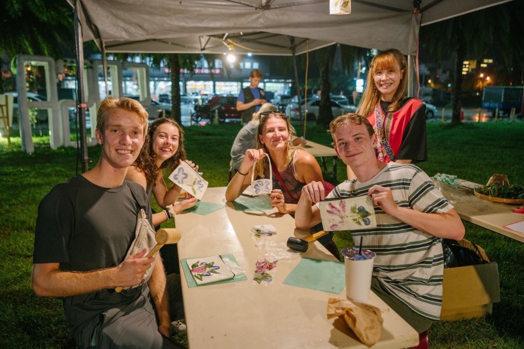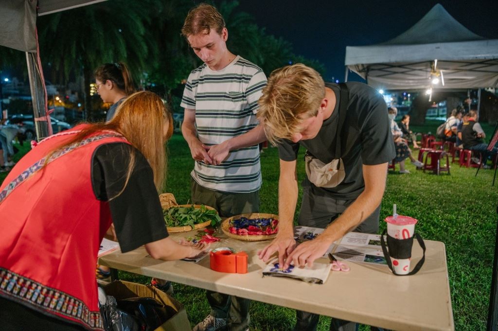 除了音樂演出,現場還特別安排了植物拓染文化體驗活動,讓觀眾親身參與,感受原住民傳統工藝的魅力。植物拓染是一種將植物的色彩和紋理轉印到布料上的技藝,透過敲打等方式,將植物的自然美融入日常生活用品中,讓觀眾體驗原住民技藝的細緻之美。