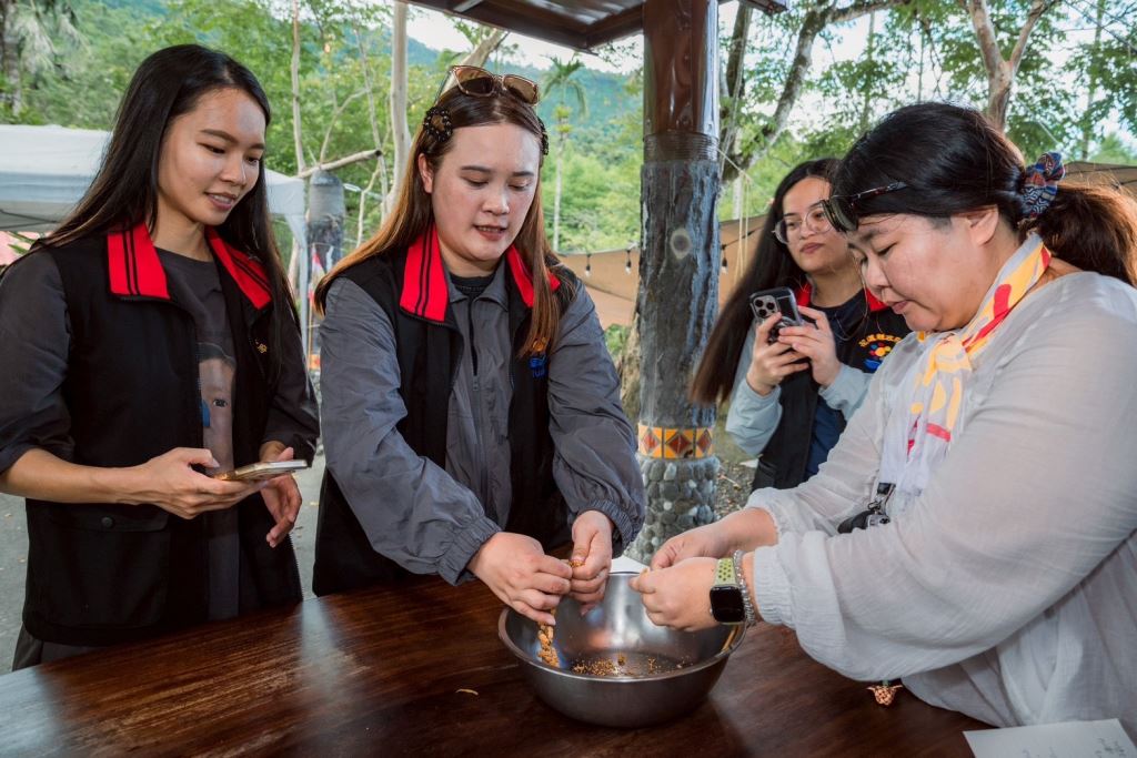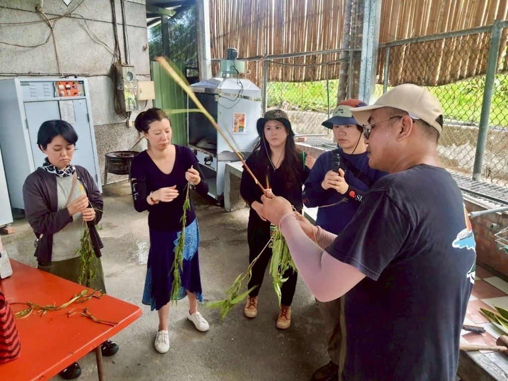 交流的腳步延伸至瑞穗鄉,透過走訪掃叭遺址與舞鶴茶區,認識在地族群遷徙與地方農業發展,並造訪舞鶴台地的茶莊,與返鄉青年茶農對談,聆聽他們在茶葉栽種與地方創生中的生命故事,感受青年投身土地的熱情與守護家鄉的行動力。進行草藥採集(如艾草、川芎、黃麻嬰等),並動手製作部落傳統點心—「會唱歌的麻糬」。夥伴們分工合作、親手搗糯到歌唱,實際體驗節氣、儀式與飲食文化之間的緊密連結。晚間則進行慢食計畫成果交流分享,來自各國夥伴依序介紹其推動慢食旅遊的經驗與挑戰,交流中凝聚更多跨文化行動的可能性。