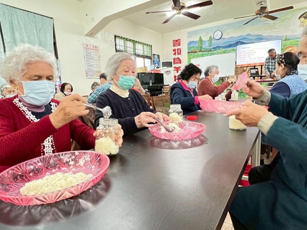 在毛線頭飾課程中,長者以紅白毛線編織出專屬自己的文化樣式;薏苡項鍊及羽毛髮簪課堂上,專注的串珠與細緻的組裝,讓手部動作與情緒逐漸穩定。酒釀課程中瀰漫的米香,更勾起大家共同的生活記憶,讓文健站一瞬間充滿「家的味道」。