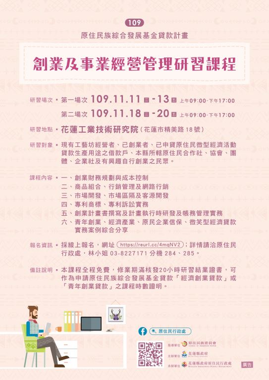 註:本課程全程免費,修業期滿核發20小時研習結業證書,可作為申請原住民族綜合發展基金貸款「經濟創業貸款」或「青年創業貸款」之課程時數證明。