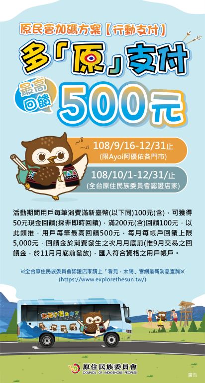 【公告】原住民族委員會辦理會108年度「擴大秋冬國民旅遊獎勵計畫-部落心旅行」自由行行動支付優惠活動辦法暨宣傳電子檔各1份。