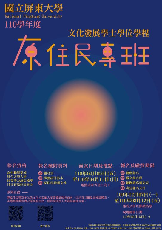 【轉知】國立屏東大學校原住民專班110學年度招生宣傳海報及簡章(如附件),請踴躍報名。