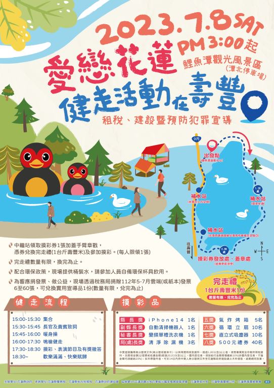 花蓮縣政府訂於112年7月8日(星期六)下午3時假鯉魚潭觀光風景區潭北停車場舉辦健走活動,摸彩獎項達70多項。
