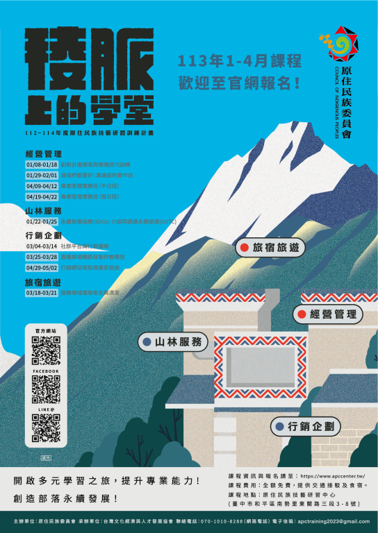 原住民族委員會辦理113年度-原住民族技藝研習訓練課程,歡迎本縣符合資格者踴躍報名參訓。