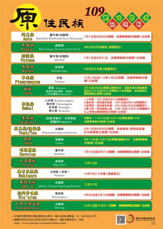 109年度原住民族歲時祭儀放假日期