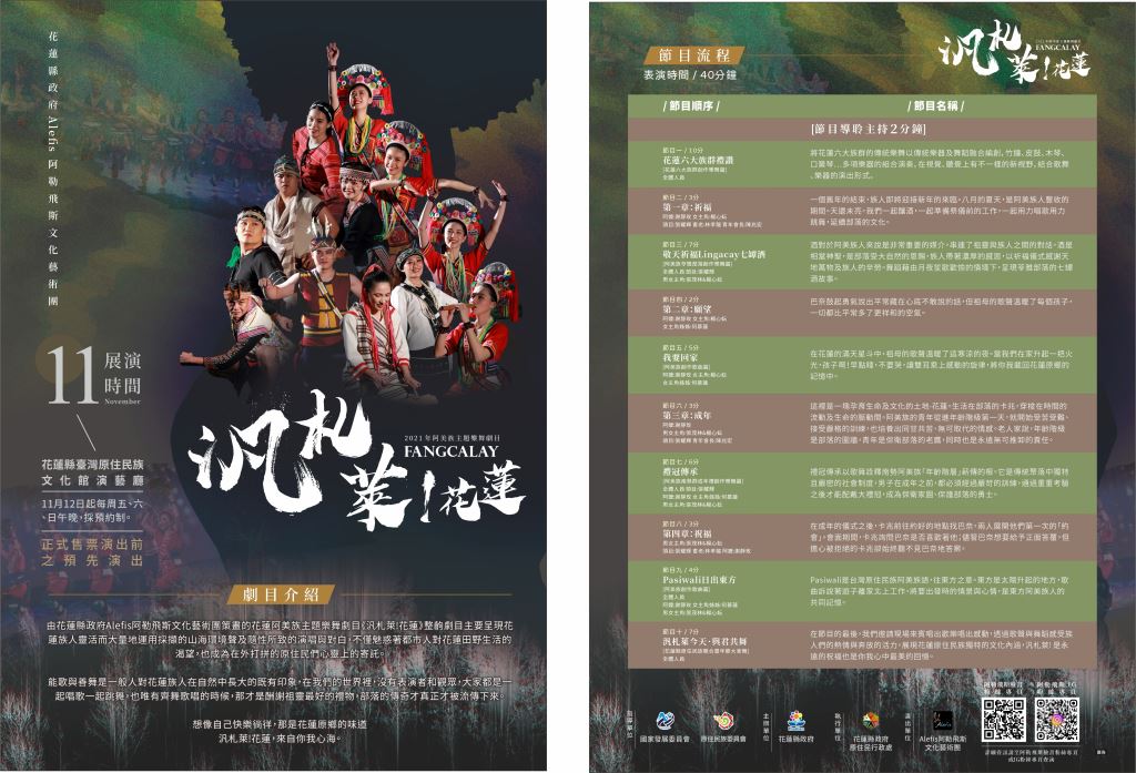 [期間限定]花蓮縣政府原住民族樂舞人才培育暨扶植團隊「阿勒飛斯文化藝術團」的花蓮阿美族主題樂舞劇目《汎札萊·花蓮》於11月開始辦理,整齣劇目主要呈現花蓮族人靈活而大量地運用採擷的山海環境聲及隨性所致的演唱與對白,希望傳遞最真實的文化之美與感動,並為接下來於本縣臺灣原住民族文化館的正式售票演出做宣傳。