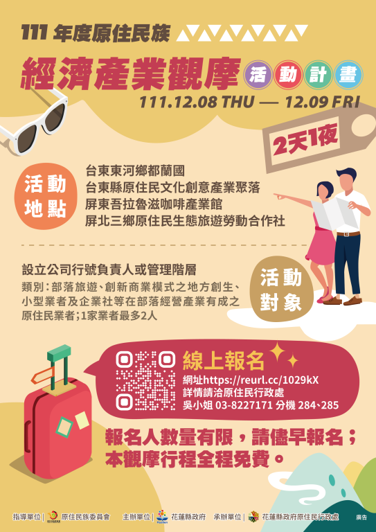 如有相關疑問,請洽詢03-8227171轉284或 285、專線 03-8221680 原住民行政處部落經濟科吳小姐。