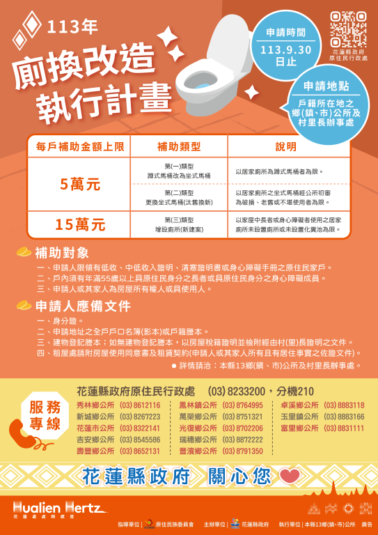 「花東衛生『廁換改造』執行計畫」受理期限延長至113年9月30日囉!符合補助資格的族人們把握申請機會。