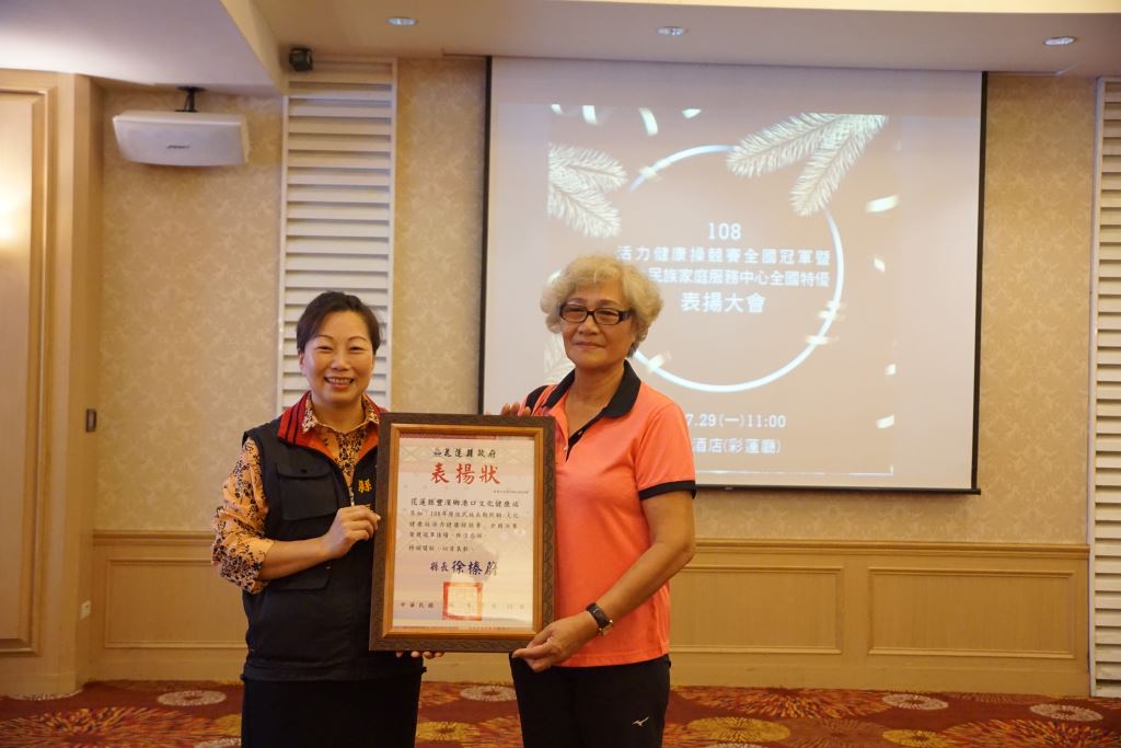 花蓮縣「108年活力健康操競賽全國冠軍暨原住民族家庭服務中心(原家中心)全國特優表揚大會」,今(7/29)天在翰品酒店舉行,縣長徐榛蔚親自表揚勇奪今年活力健康操競賽全國冠軍的豐濱鄉港口文化健康站以及榮獲中央評鑑「特優」的玉里鎮原家中心、瑞穗鄉原家中心及卓溪鄉原家中心,成績大放異彩,「花蓮厲害」代表隊果然名不虛傳。