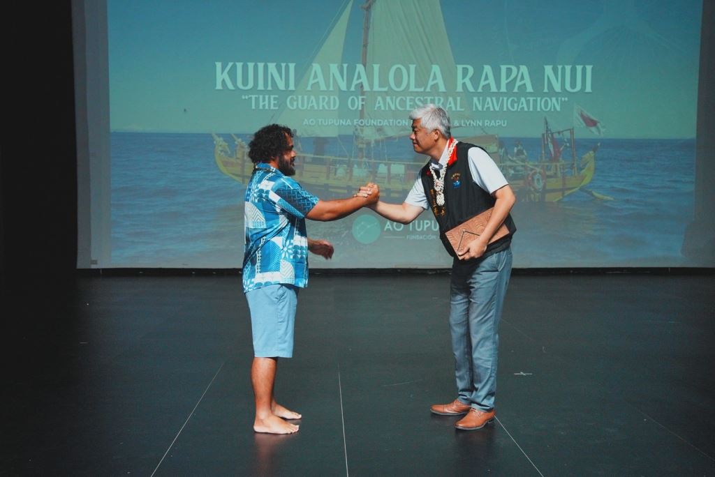 活動尾聲,復活節島藝術家 Adrian Hetereki 特別致贈一幅描繪當地自然景觀與文化象徵的畫作予臺灣原住民 族文化館,象徵花蓮與Rapa Nui之間的文化連結與深厚情誼。縣府原住民行政處處長馬呈豪(Malay Boya)代表受贈時表示:「花蓮與太平洋多個南島族群同屬南島語系,透過文化交流不僅深化彼此連結,更有助於增進族群間的互信與理解,進而促進國際原住民族間的合作關係。」