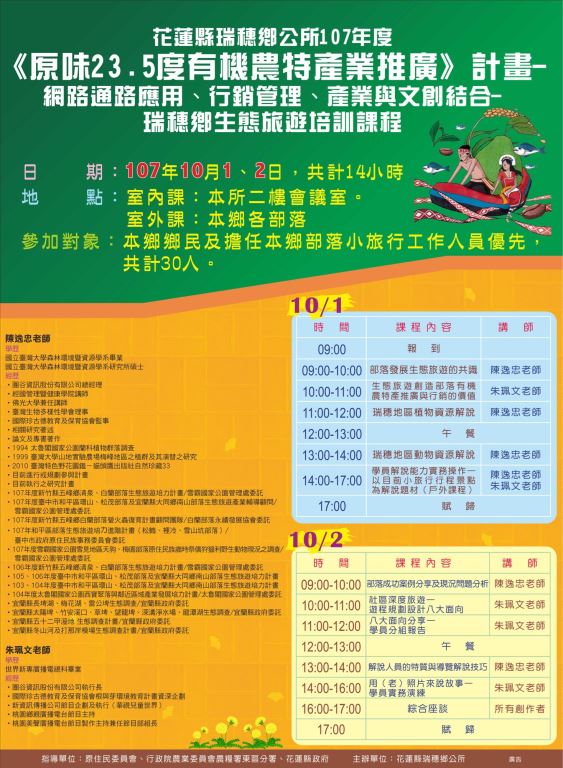 網路通路應用、行銷管理、產業與文創結合-瑞穗鄉生態旅遊培訓課程 日期:107年10月1~2日,共計14小時 地點:室內課:瑞穗鄉公所二樓會議室 室外課:瑞穗鄉各部落 參加對象:瑞穗鄉鄉民及擔任瑞穗鄉部落小旅行工作人員優先,共計30人