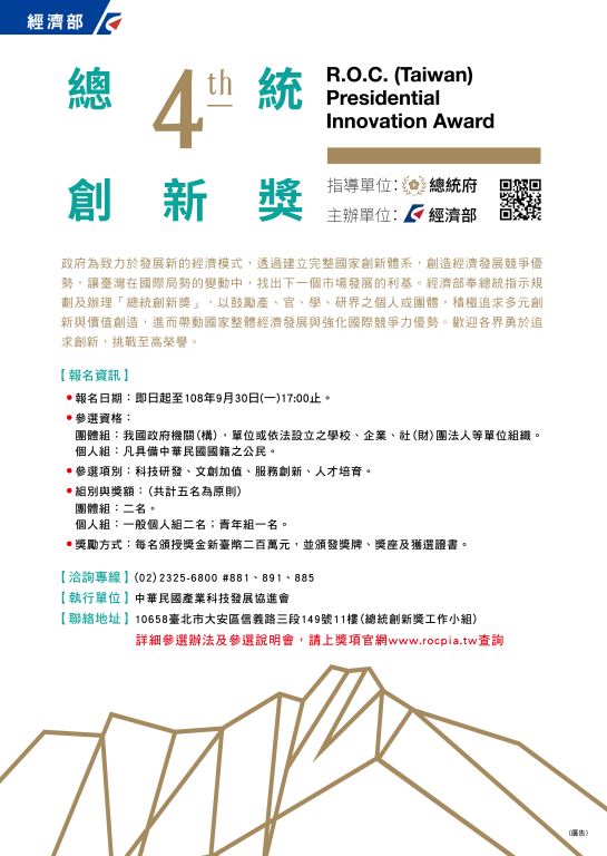 第四屆「總統創新獎」自即日起至本(108)年9月30日止受理各界推薦及報名,為讓各界瞭解甄選作業與相關規定,自本年8月26日起,規劃於臺北、新竹、臺中、臺南、高雄及花蓮辦理參選說明會,相關參選及說明會訊息請至「總統創新獎」網站查詢(