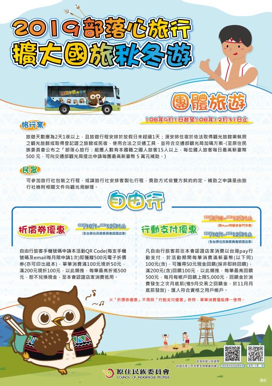 【公告】原住民族委員會「108年擴大國旅秋冬遊補助計畫-部落心旅行」第4梯次申請暨宣傳說明會,請業者踴躍參加。