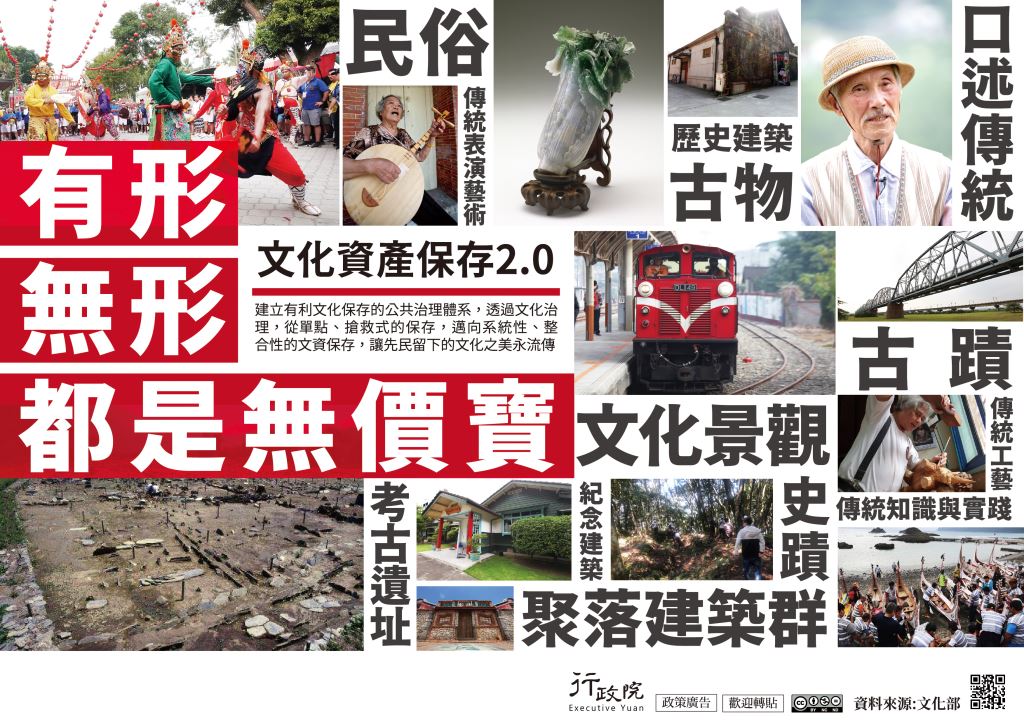 為建構完整的文化資產守護網,政府正推動「文化資產保存2.0」,透過文化治理,從單點、搶救式的保存邁向系統性、整合性的文資保存,讓文化保存、城市發展及國家政策共存共榮,特策製旨揭電子單張文宣(eDM),請協助推廣運用,電子檔請至行政院全球資訊網「政策與計畫─政策櫥窗」項下下載。