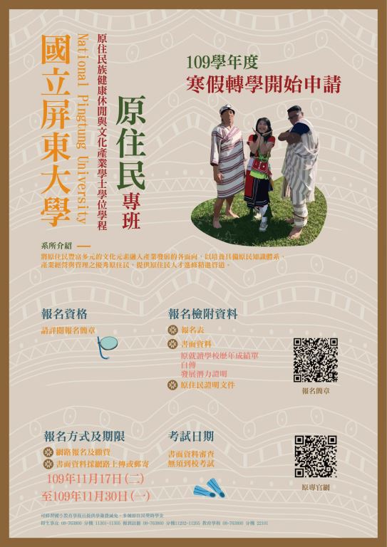 【轉知】國立屏東大學校原住民族健康休閒與文化產業學士學位學程原住民專班109學年度寒假轉學考招生宣傳海報及簡章各1份,請查照。