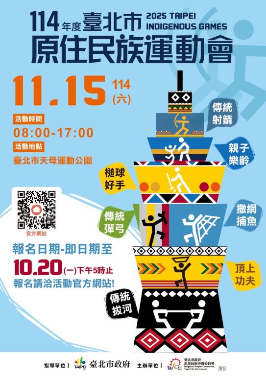 【轉知】臺北市政府114年11月15日辦理「114年度臺北市原住民族運動會」,請協助廣為宣傳並踴躍報名參加!
