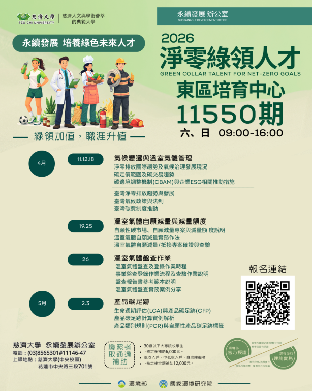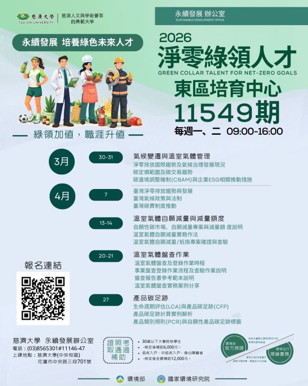 一、為配合環境部推動2050年淨零排放目標,強化本縣永續發展整體能量,由環境部委託慈濟大學(東區培育中心)辦理「淨零綠領人才培育課程」,課程內容涵蓋氣候變遷、溫室氣體管理、碳盤查作業及產品碳足跡等核心主題,請