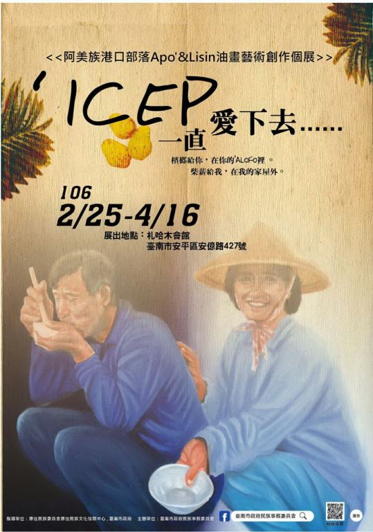 臺南市政府辦理「'Icep愛下去-阿美族港口部落Apo'&Lisin油畫藝術創作個展」及「府城‧原鄉-三大原住民族群文化特展」歡迎踴躍前往參觀。