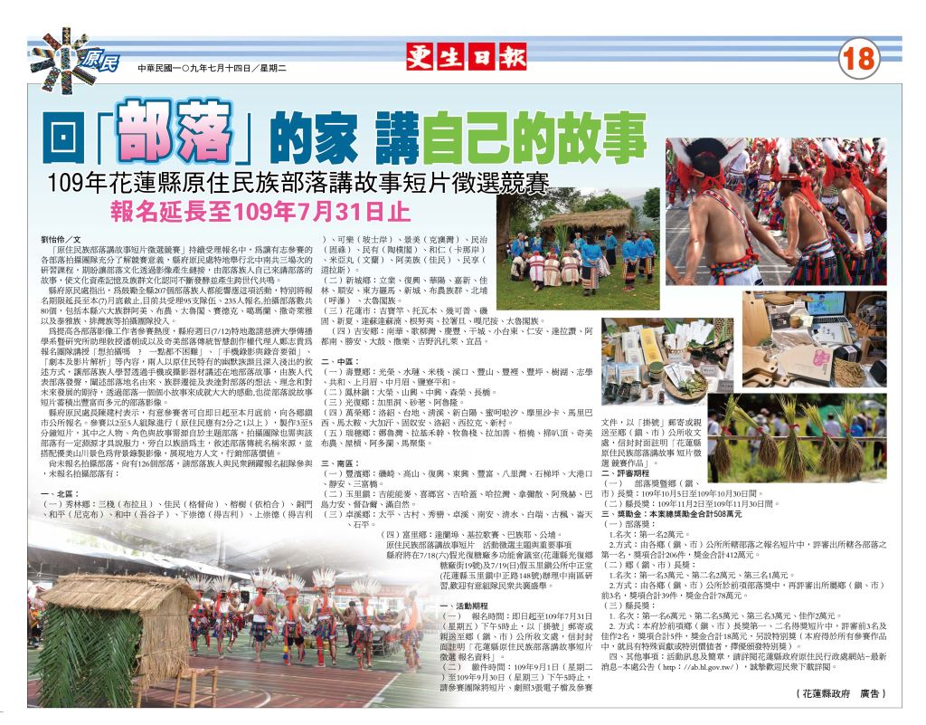 (一) 報名時間:即日起至109年7月31日(星期五)下午5時止,以「掛號」郵寄或親送至鄉(鎮、市)公所收文處,信封封面註明「花蓮縣原住民族部落講故事短片徵選 報名資料」。