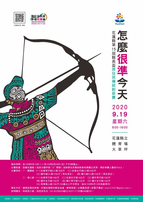 花蓮縣政府謹訂於109年9月19日(星期六)假縣立體育場旁德興大草坪,舉辦一年一度的縣長盃原住民傳統射箭賽,總獎金高達33萬元。此外,為傳承原住民族弓藝文化,建立多元藝術文化平台,激盪原住民族弓藝創作能力,於場內同時舉辦「巧奪天弓」原住民傳統弓藝選拔決選及最佳人氣獎之票選,供選手與民眾接觸原住民特有傳統技藝並與創作者進行弓藝創意交流,讓活動中有射箭的技術,也有弓藝創作的藝術,歡迎民眾現場票選最佳人氣獎,透過「最佳人氣票選活動」一起支持自己喜歡的作品及工藝家。