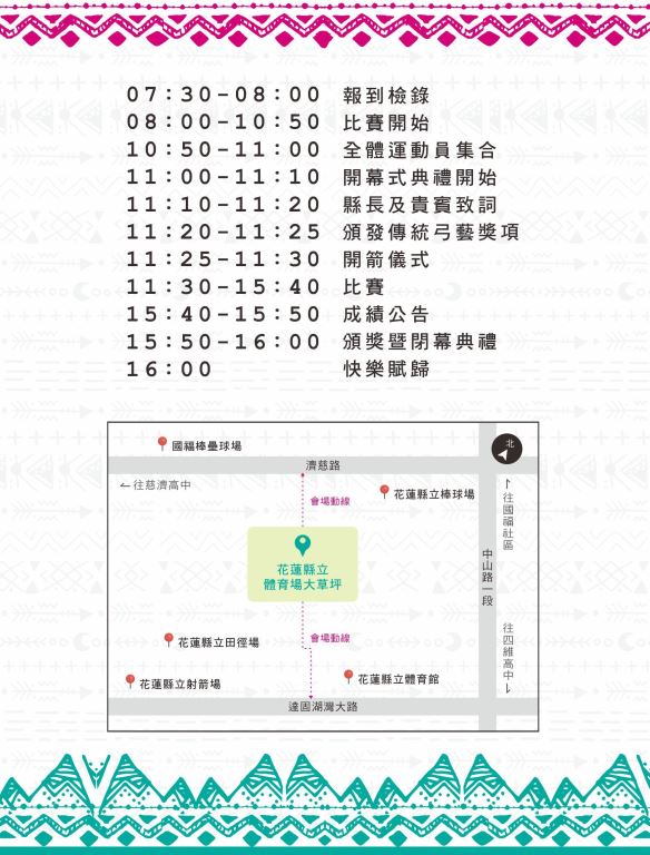 花蓮縣政府原住民行政處陳建村處長表示原住民傳統射箭賽由選手自備弓與箭,木弓或竹弓均可,但不得用加工工業製材料及加裝瞄準器,亦不得使用連接式(合成式)的竹弓或木弓,必須一體成形之傳統木弓或竹弓為主,因此相較於正式比賽如世運、亞運更添加了傳統的風味,使用技術也較困難,但相信選手都能在比賽中經箭與箭靶的交互共鳴中,展現自己最完美的技術,在此屆傳統射箭賽寫下佳績,賽事於9月19日上午7時30分至下午4時舉辦,歡迎有興趣的民眾前往觀賽,一起為選手加油,並欣賞與感受傳統弓所帶來的魅力。
