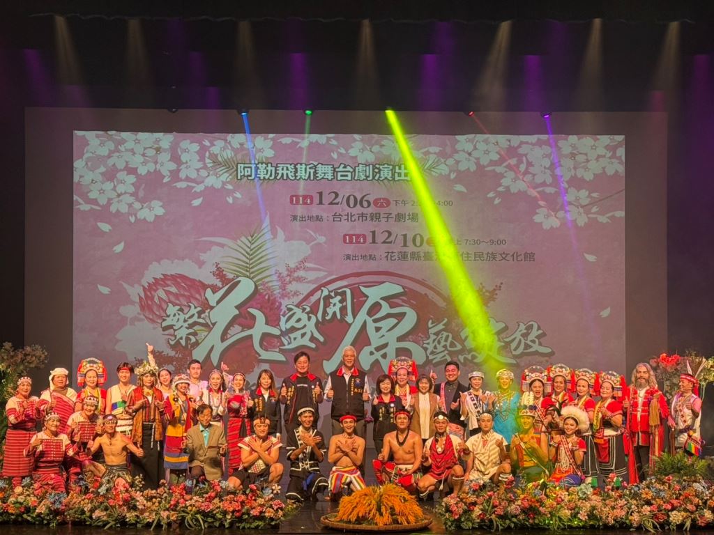 由花蓮縣政府長期扶植的阿勒飛斯文化藝術團推出大型舞台劇《Kacelakan nu varu 繁花盛開・原藝綻放》,並於 12 月 6 日下午 2 時 30 分在台北市親子劇場正式演出。本劇以花蓮六大原住民族文化為核心發想,結合舞蹈、歌唱、族語吟唱及多媒體影像,構築一段跨越山海、族群與世代的文化敘事。展演消息發布後,即廣受文化界人士與社會大眾高度關注。